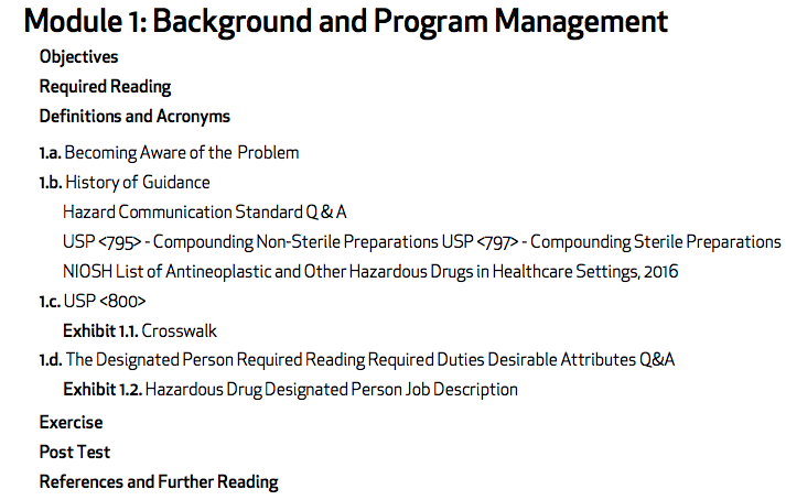 The self-paced study guide is divided into two sections – Administrative Topics and Handling Hazardous Drugs – with a total of 14 different modules. Each module covers a topic that the DP is required to be familiar with. These topics include: